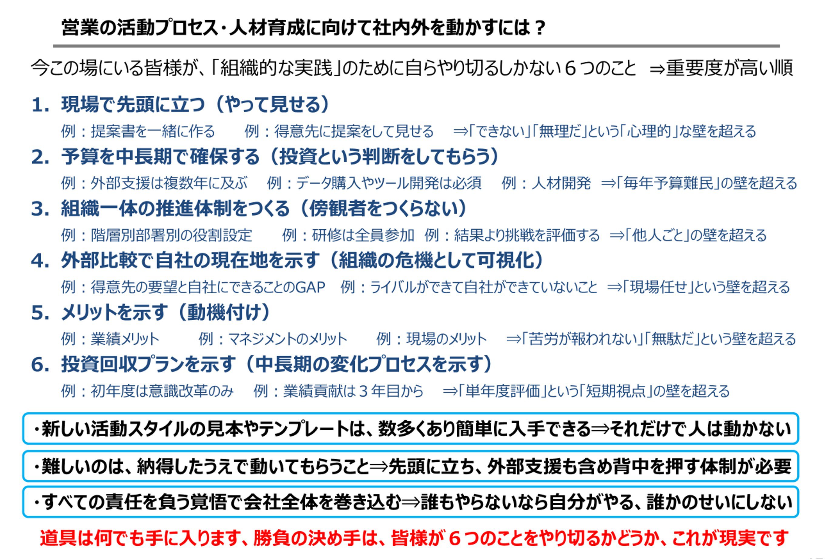 まず、谷氏からは、営業変革推進の壁を乗り越えるための6つのポイントについて、消費財メーカー勤務時代に営業変革を進めた際の経験を元に、具体例を交えてご紹介いただきました。