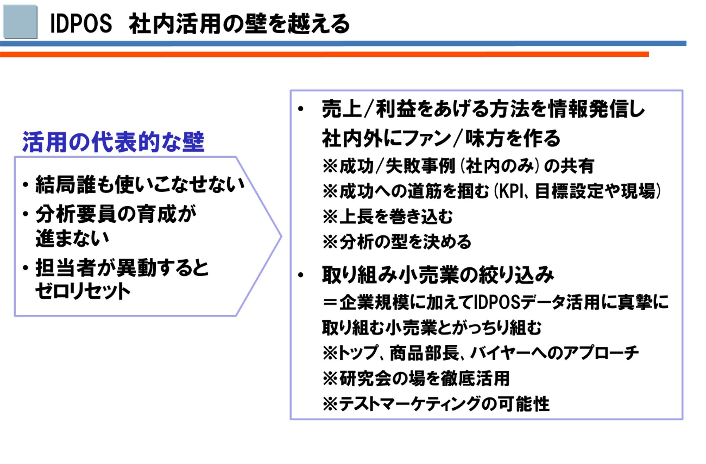 奥島氏からは、IDPOS導入・活用推進時に直面する壁について、多くのメーカー・小売業で起きている実例をもとに、実践的な示唆をいただきました。